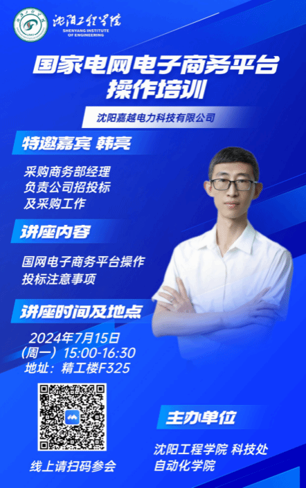 2024年7月15日,学校科技处与太阳成集团tyc33455ccww与联合举办了由沈阳嘉越电力科技有限公司韩亮经理主讲的“国家电网电子商务平台操作培训”专题讲座。本次培训在精工楼F325举行,吸引了我校众多师生和相关专业人员的参与,为大家提供了一个深入了解国家电网电子商务平台操作及投标流程的重要机会。