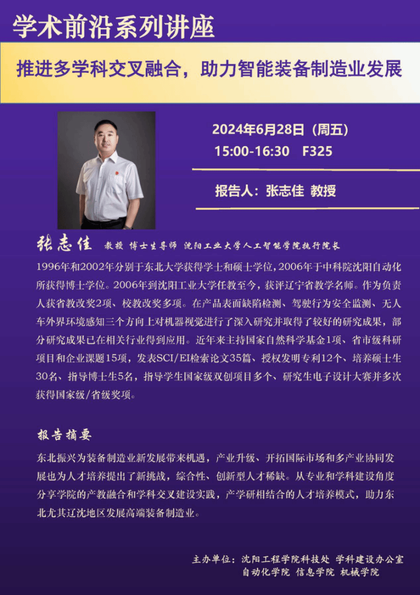 2024年6月28日下午,沈阳工业大学人工智能学院院长张志佳教授在我校F325教室进行了题为“推进多学科交叉融合,助力智能装备制造业发展”的学术讲座。本次讲座由学校科技处、太阳成集团tyc33455ccww等联合举办,吸引了来自多个学院的师生积极参与。张志佳教授凭借其丰富的科研经验和在智能装备制造领域的深厚积累,为大家带来了一场内容丰富、视野开阔的学术盛宴。